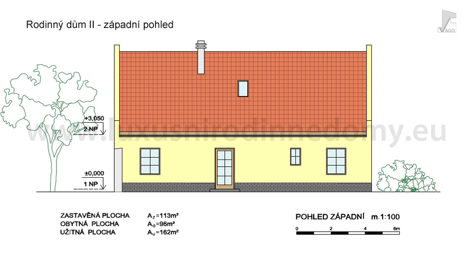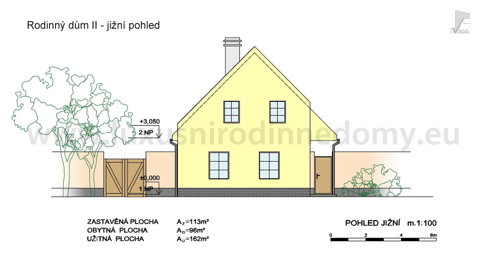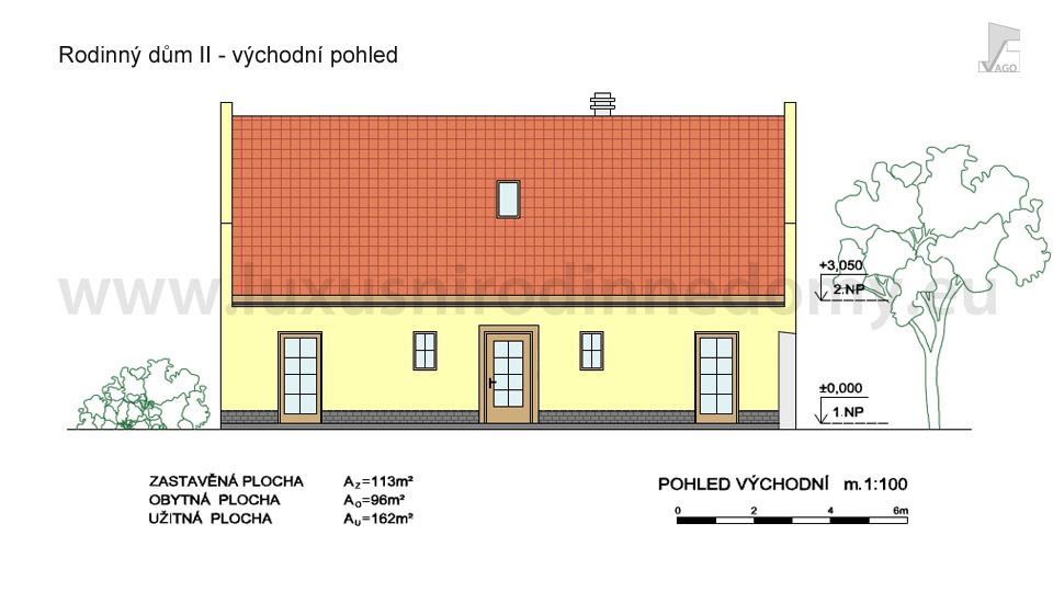 - Parkování mimo disposici domu. Sedlová střecha sklon 45° s nadstřešní atikou.
