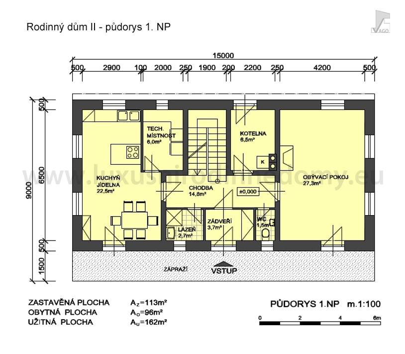 - V 1. NP důsledně oddělený obývací pokoj od obytné kuchyně s výstupem do zahrady, zápraží, zázemí vhodné na topení dřevem.